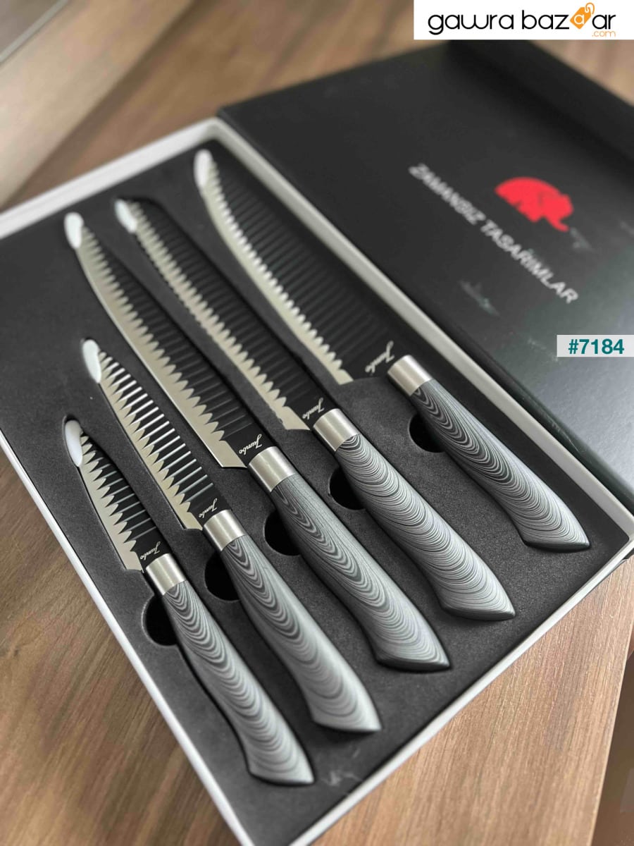 يتميز بسكين الشيف وسكين اللحم وسكين الخبز بسماكة 1.8 مم وسكين متعدد الأغراض وسكين تقشير بسماكة 1.2 مم. الجسم المنقوش مصنوع من الفولاذ ، مما يمنع الالتصاق أثناء القطع. إنها توفر عملية قطع سهلة بفضل الشفرة الخاصة المطلية بطبقة مانعة للالتصاق. حلقة الارتباط الوسيطة من الفولاذ. لها مقبض سيليكون خشبي المظهر. يوصى بالغسيل اليدوي باستخدام أدوات التنظيف غير الصلبة مثل الإسفنج والمنظفات السائلة.