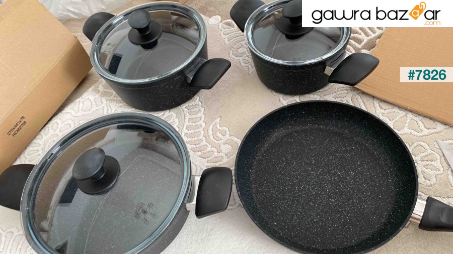 Karaca Defne Biogranit V2 طقم أواني طهي مكون من 7 قطع أسود مجموعة محتويات وعاء عميق (18 سم) (1.8 لتر) + غطاء