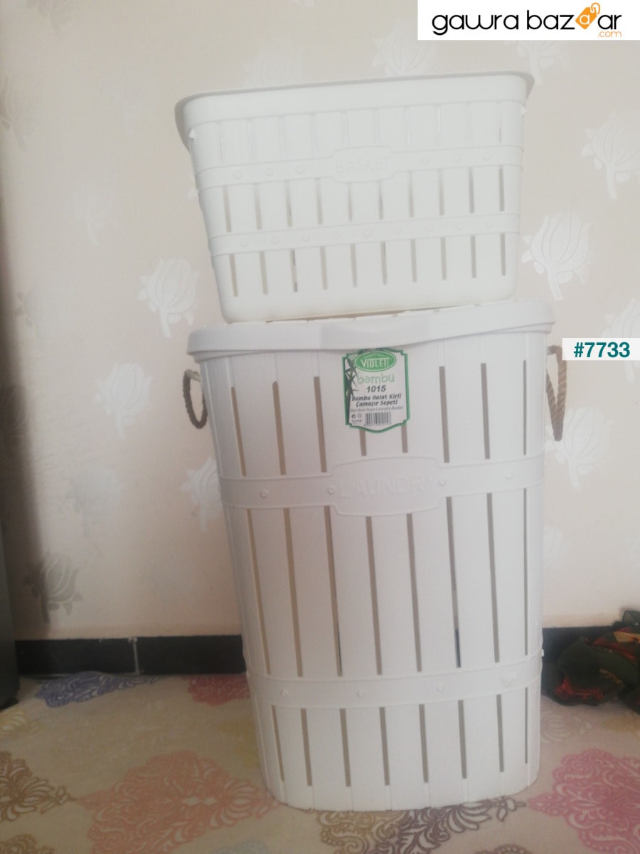 سلة غسيل متسخة بحبل الخيزران الأبيض + مجموعة حمام سرج الغسيل